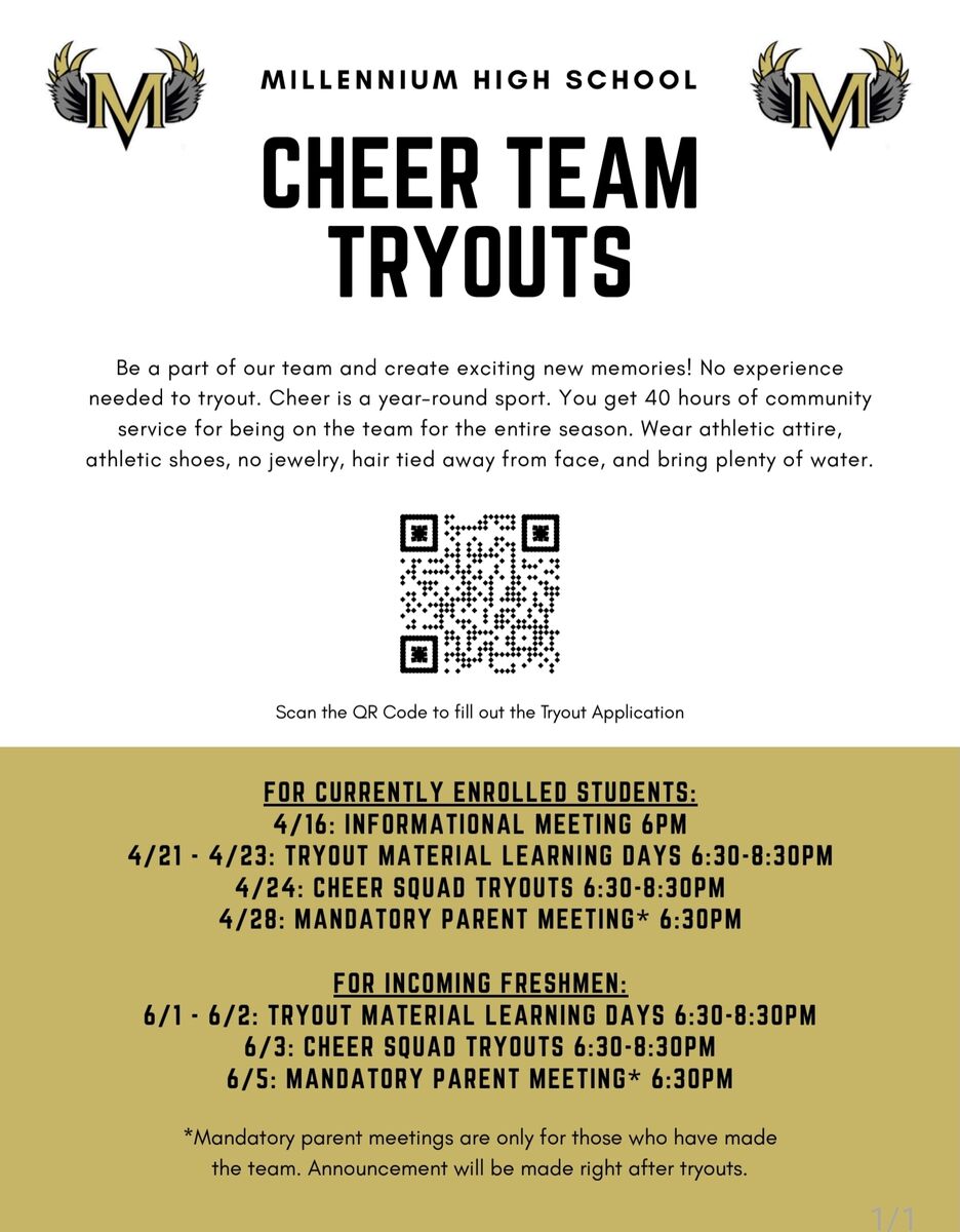 Good morning, everyone! Check the flyer below for information regarding the upcoming cheer tryouts. Please note the difference for currently enrolled students and incoming freshmen. Have a great day!